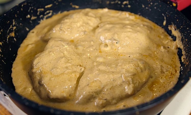 Положите куриные кусочки обратно в соус и готовьте еще 10-12 минут, чтобы мясо пропиталось ароматным грибным соусом.