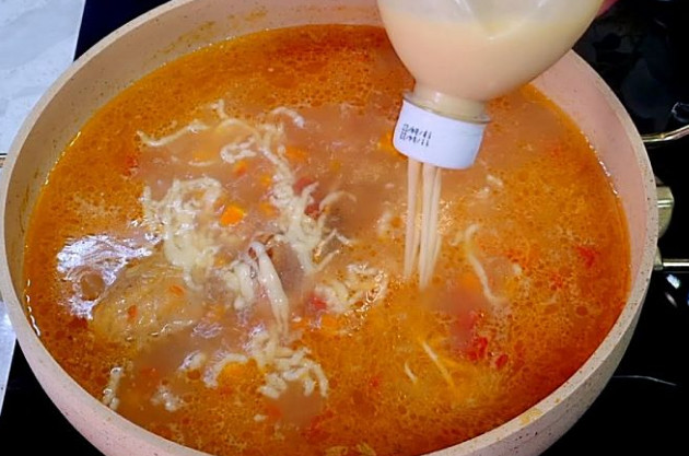 Завинчиваем крышку и встряхиваем бутылку. В крышке делаем тонкие отверстия и теперь просто выдавливаем получившееся тесто прямо в кипящий суп. Через 3 минуты он будет готов к подаче.