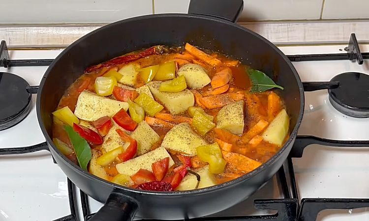 Разогрейте сковороду и добавьте масло. Обжарьте нарезанный лук, картофель, морковь, помидоры и болгарские перцы до золотистой корочки.
