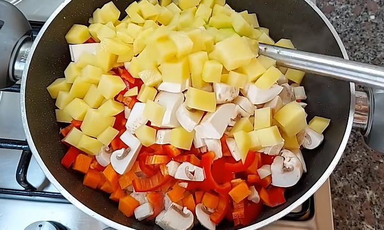 Разогрейте сковороду и обжарьте курицу вместе с овощами. Готовьте все ингредиенты под крышкой, постоянно помешивая, около 10 минут.