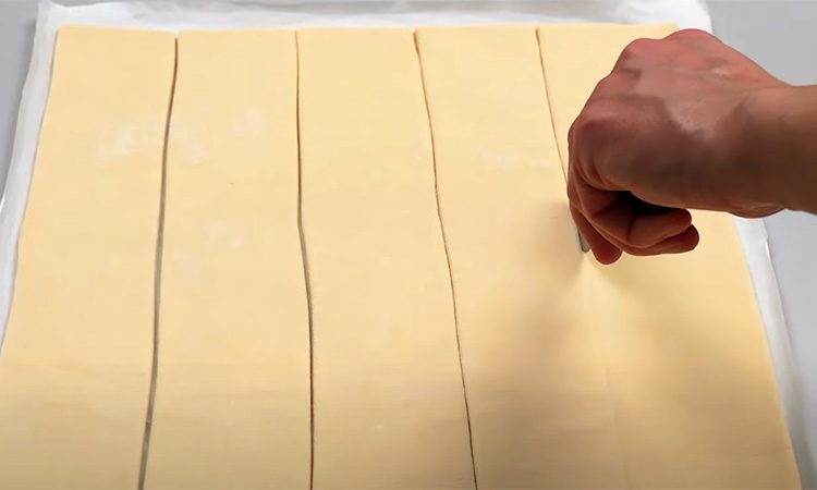 Слоеное тесто режем широкими полосами. Каждую отдельно выкладываем на рабочую поверхность и распределяем по ней апельсиновый джем.