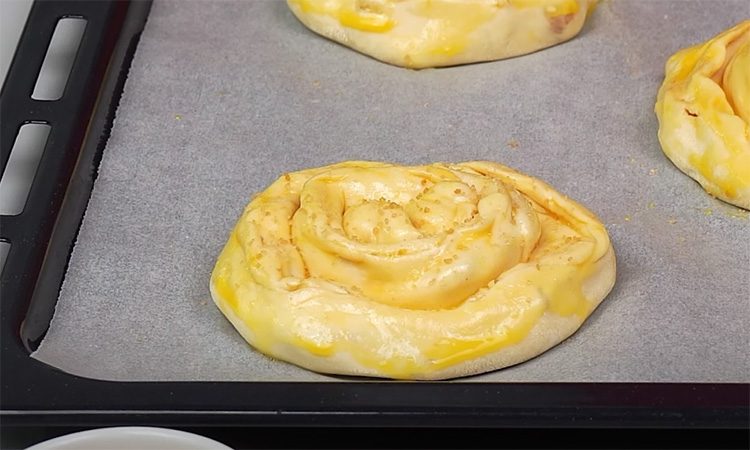 Теперь заворачиваем полоску «улиткой» и переносим на застеленный пергаментом противень. В отдельной емкости смешиваем желток, коричневый сахар и молоко.