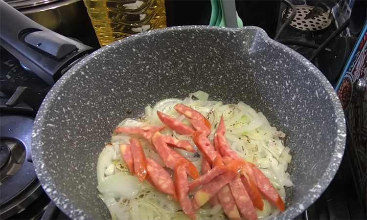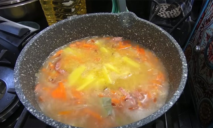 Лук и морковь режем тонкой соломкой и обжариваем на растительном масле пару минут. Удобнее все делать сразу в глубоком сотейнике, подойдет и кастрюля с толстым дном. Добавляем к овощам сосиски, тоже нарезанные соломкой. Жарим еще минуту, заливаем водой, добавляем лавровый лист и нарезанный картофель.