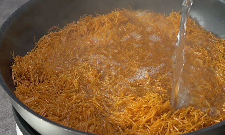 Поставьте сковороду на средний огонь и дайте ей прогреться. Добавьте вермишель на сковороду и обжарьте ее до золотистого цвета, постоянно помешивая. Это займет от 8 до 10 минут.