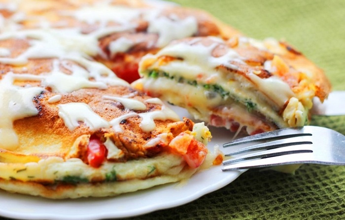 Остальные две лепешки нужно обжаривать по аналогии с предыдущей. Только в первом случае четыре яйца нужно смешать с печеным перцем, а во втором с кабачками, предварительно припущенными на сковороде.