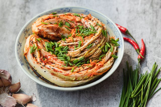 Диетическая квашеная капуста из Кореи – непростая гостья на нашем столе: она, как уверяют жители полуострова, способствует сжиганию жиров в организме, поддерживает иммунитет и даже лечит от похмелья. Рецепт такой азиатской панацеи требует только одного экзотического ингредиента – рисовой муки.Состав: кочан пекинской капусты, одна морковь, полголовки красного лука, один небольшой красный острый перец, 7 зубчиков чеснока, 1 ч. л. сухого имбиря, 1 стакан рисовой муки, 200 г соли.