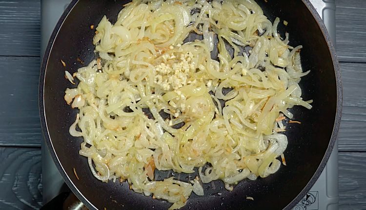 Режем лук полукольцами и обжариваем на сливочном масле до золотистого цвета. Добавляем нарезанный чеснок, держим все вместе на огне еще минуту и перекладываем зажарку в миску.