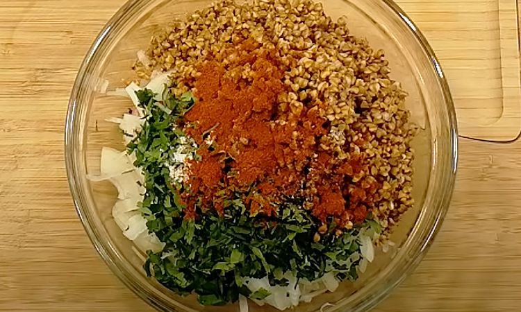 Распарьте 80 граммов гречневой крупы, замочив ее в кипятке. Как только гречка чуть набухнет, добавьте ее к фаршу и присыпьте смесь паприкой для дополнительного копченого вкуса.