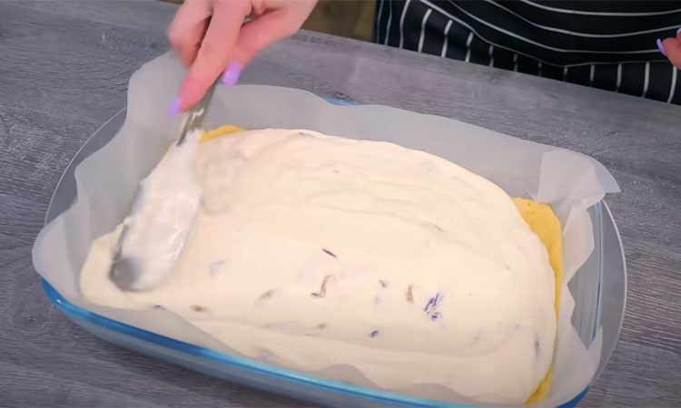 Изюм заливаем теплой водой. Берем творог любой жирности и добавляем к нему молоко, сахар, крахмал, соль, ванильный сахар и желтки 3 яиц — белки от них нам понадобятся позже. Все ингредиенты пробиваем в блендере до однородной массы. Добавляем изюм и распределяем его равномерно по всей массе.