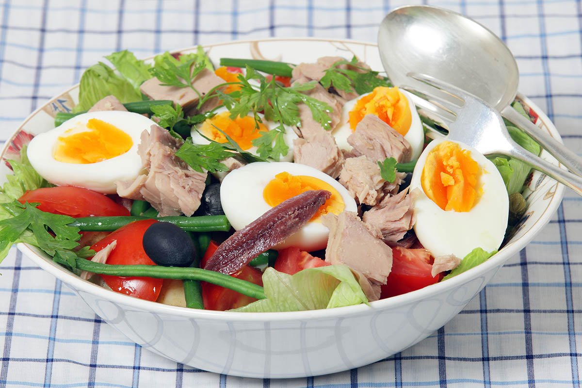 Печень трески достань из консервной банки (тунец тоже подойдет). Все продукты сложи в салатницу, в которой будешь подавать на стол, и заправь оливковым маслом.