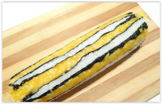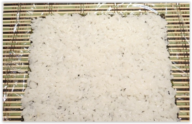 Выложить на бамбуковый коврик лист нори, на него — белую часть риса толщиной примерно в пол сантиметра. Прикрыть его еще одним листом нори.