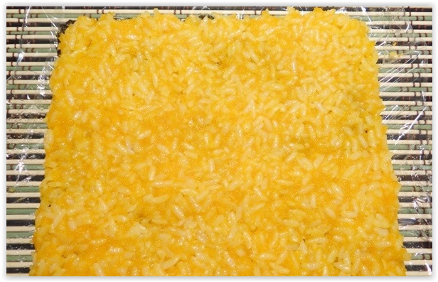На этот лист выложить оранжевый рис и аккуратно утрамбовать.
