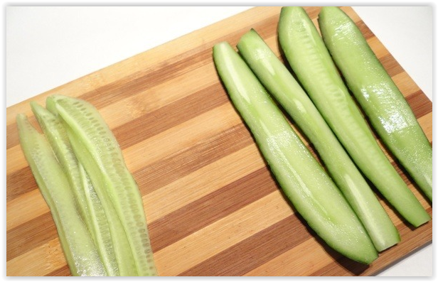 Порезать огурец вдоль на тонкие полосочки и также нарезать красную рыбу (горбушу, форель или лосось).