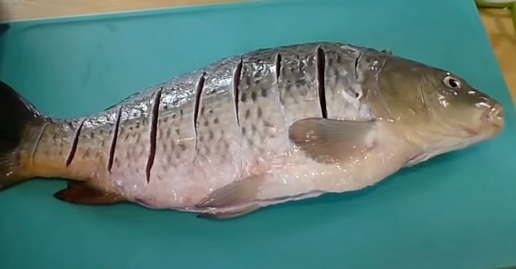 Нарежьте каждого карпа по всей длине на ширину пальца, доведя лезвие прямо до костей. Сделайте надрезы с обеих сторон.