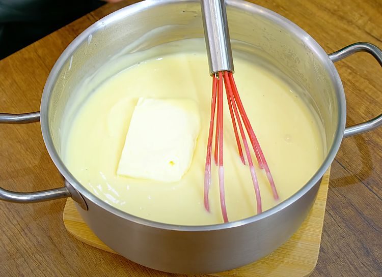 Когда крем начнет загущаться, добавьте в него нарезанное сливочное масло и ванильный сахар. Перемешайте крем до тех пор, пока он не станет однородным. Убедитесь, что в креме нет комочков. Снимите крем с огня и накройте его впритык пищевой пленкой, чтобы избежать образования пенки.