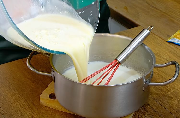 Затем постепенно влейте половину горячего молока в смесь, постоянно помешивая, чтобы избежать образования комков.