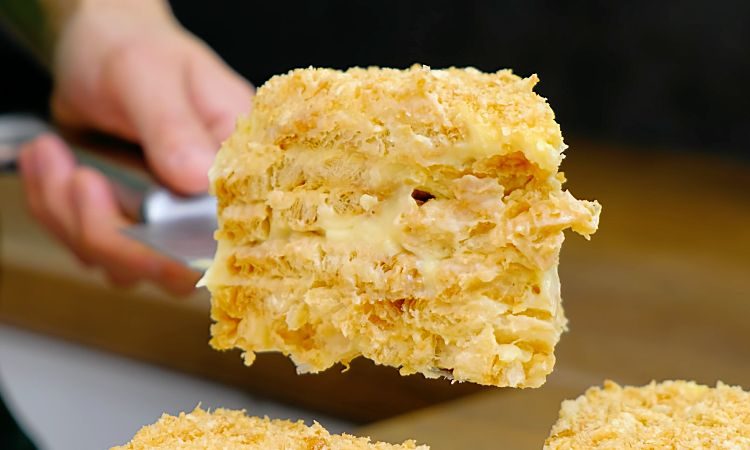Удивительно нежный и сочный торт Наполеон без использования духовки или сковороды. Вместо этого используется слоеное печенье и крем, которые собираются в слои и оставляются на несколько часов для пропитки.