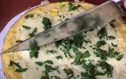 Когда поверхность кукурузной основы поджарится, высыпаем на нее сыр и готовим еще всего 2 минуты на слабом огне.