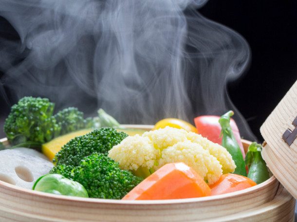 Такие блюда на пару. Удобнее всего делать это в электрической пароварке с таймером. Но подойдёт и кастрюля-пароварка для обычной плиты.