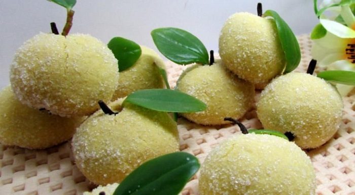По истечении времени достаньте тесто, разделите его на небольшие кусочки и скатайте шарики величиной с грецкий орех. Обваляйте каждый шарик в сахар, предварительно насыпанный в плоскую тарелку, и воткните по две звездочки гвоздики с противоположных сторон, чтобы получилось «яблоко».