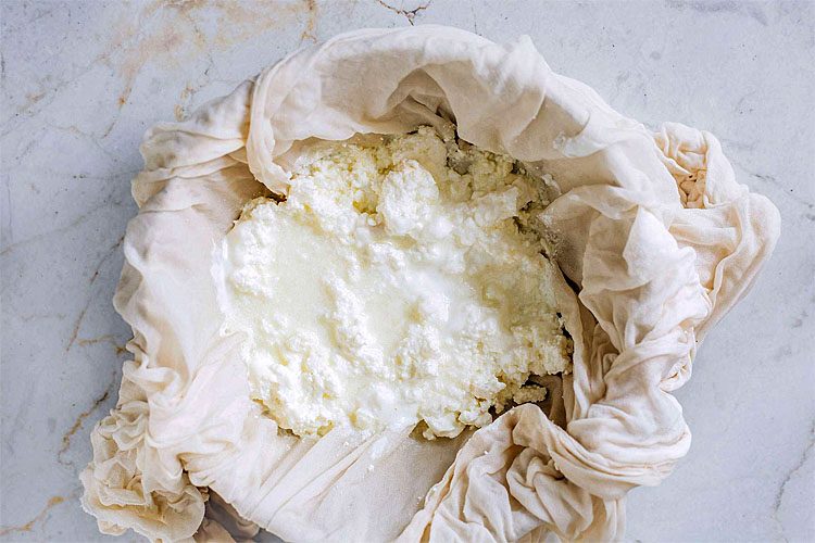 Шаг 4: Когда сыворотка полностью отделится, перелейте ее через дуршлаг и марлю в подходящую по размеру емкость. Дайте стечь сыворотке, завяжите марлю и сверху поставьте гнет, оставьте так, пока не стечет вся сыворотка.