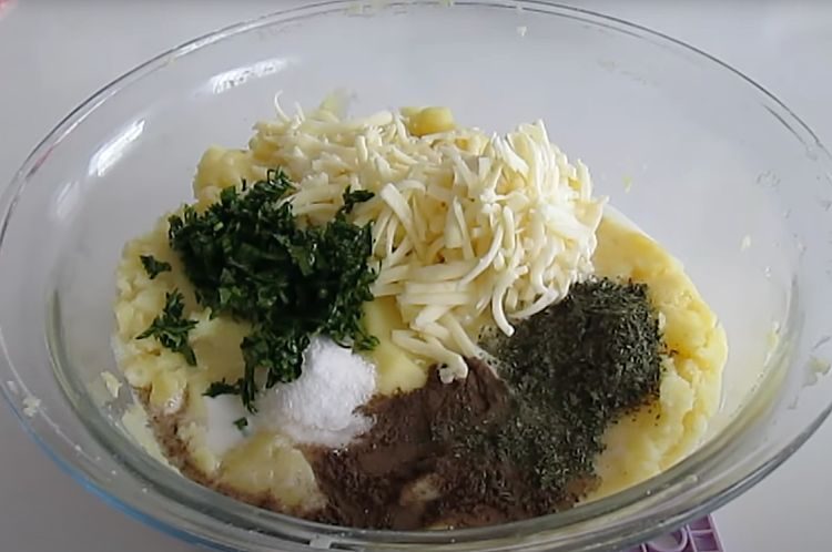 Когда картошка будет готова, ее нужно откинуть на дуршлаг и дать ей остыть. Затем толочь картофель с помощью толкушки для пюре, добавляя натертый твердый сыр, перец, молоко, и зелень петрушки по вкусу. В конечном итоге, должна получиться однородная масса.