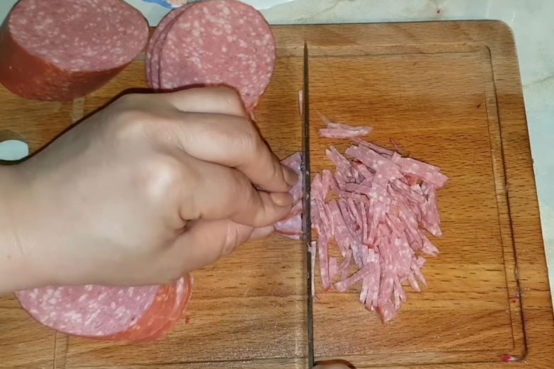 Дальше нарежь колбасу, чтобы кусочки получились по размеру такими же, что и огурцы с редиской.