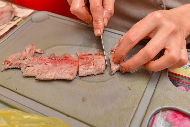 Хорошенько почисти селедку и разбери ее на филе. Не должно быть черной пленки, мелких костей и плавников. Всё это в конечном итоге отразится на вкусе получившегося салата.