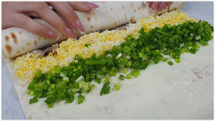 Вторая половина лаваша остается свободной. Теперь сворачиваем лаваш с начинкой в рулет.
