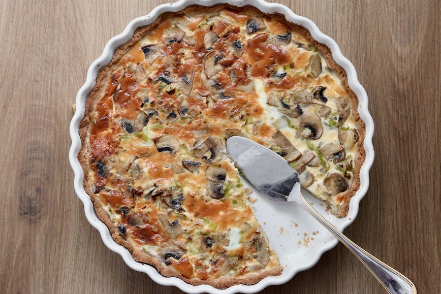 В небольшом количестве масла обжарить крупно нарезанный лук-порей и грибы. Посолить. Выложить начинку на тесто.