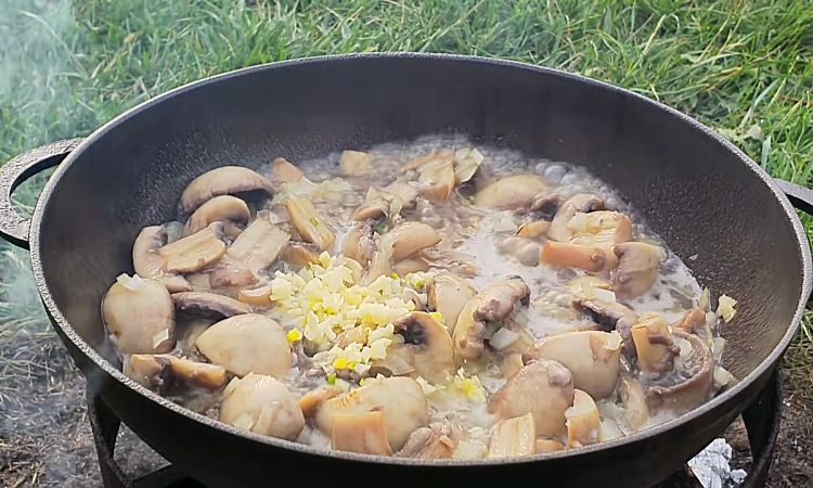 Добавьте лук и жарьте вместе с грибами в течение 4 минут. Затем добавьте чеснок.