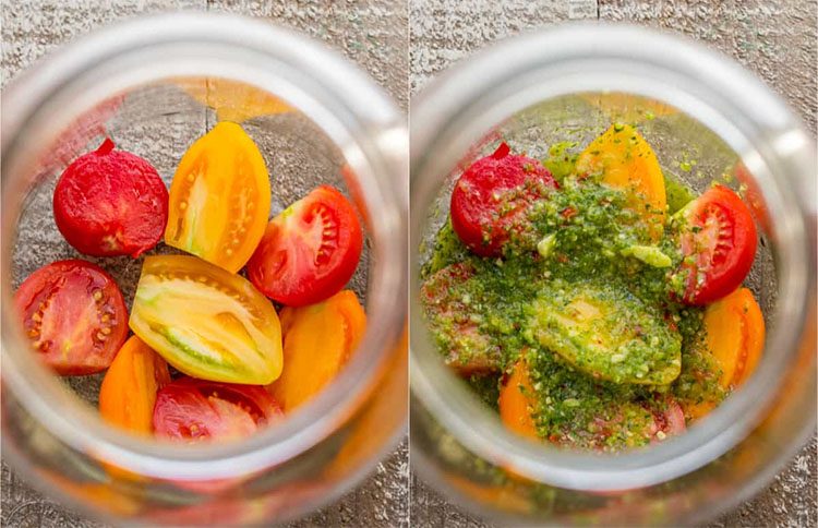 Переверните банку с помидорами, чтобы соус равномерно распределился. Затем поместите банку в холодильник и оставьте настаиваться в течение суток.