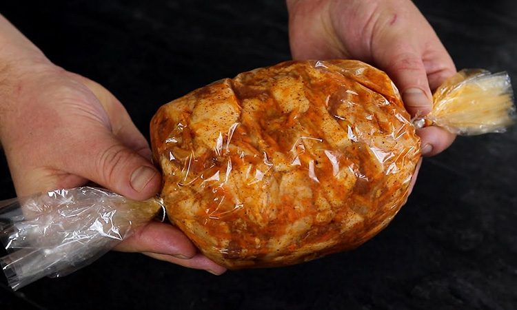 Теперь в отдельной миске смешиваем соль, мелко нарезанный укроп, черный и острый перец. Добавляем паприку и пропущенный через пресс чеснок. Получившейся смесью тщательно натираем сало, затем сворачиваем его в рулет. Его плотно пакуем в пищевую пленку, как на фото ниже.