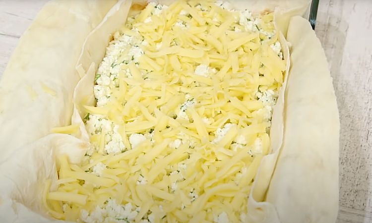 Возьмите форму для запекания и выложите на дно пергамент. Затем выложите на него лист лаваша. Равномерно распределите начинку из творога по лавашу и натертый на терке сыр сверху. Затем закройте пирог, сворачивая края лаваша сверху.