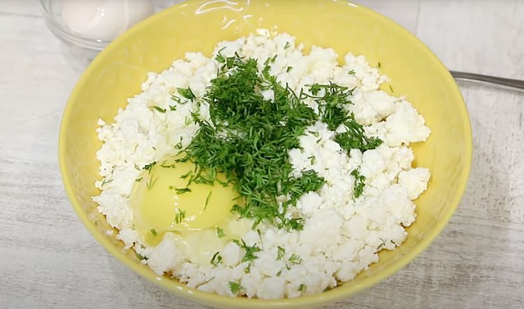 Подготовьте начинку для пирога, смешав творог, яйцо и измельченную зелень. Добавьте соль и перец по своему вкусу. Вы можете сделать это в глубокой тарелке.