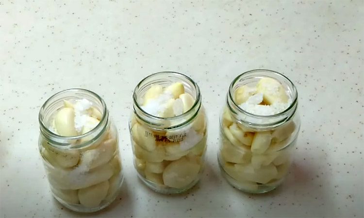 После этого наполните банки зубчиками чеснока. Добавьте по 1 чайной ложке каменной соли на каждую банку с чесноком. Каменная соль поможет сохранить чеснок свежим и предотвратить развитие болезнетворных микроорганизмов.