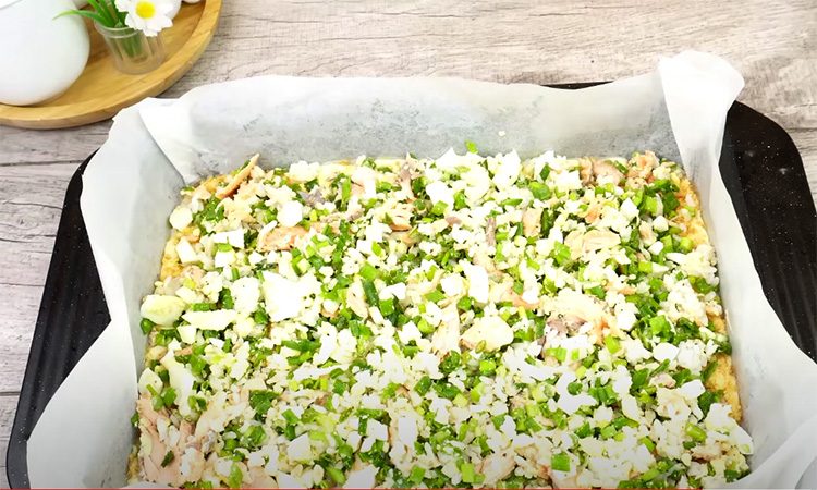 Благодаря этой маленькой хитрости тесто в заливном пироге всегда будет пропекаться и не останется влажным. Распределяем начинку, заливаем второй половиной теста. Выпекаем пирог в духовке 30 минут при 180 градусах.