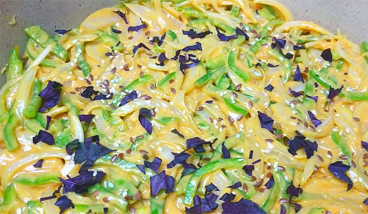 Разогрейте сковороду на среднем огне и добавьте небольшое количество растительного или оливкового масла. Вылейте приготовленную смесь на разогретую сковороду. Посыпьте сверху кунжутом и базиликом для придания вкуса и аромата.