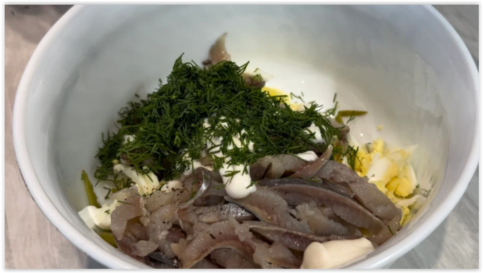Всё выкладываю в удобную чашку, добавляю перец чёрный молотый по вкусу. Мелко нарезаю по вкусу зелень укропа и добавляю майонез -3 столовые ложки.