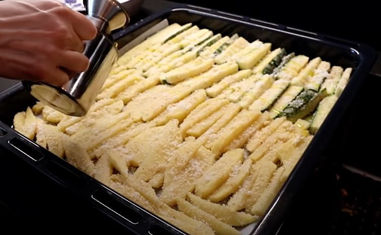 Очистите перцы от семян и нарежьте их на полоски примерно одинакового размера и толщины. Положите нарезанные перцы в глубокую миску. Очистите цуккини и нарежьте их также на полоски. Выложите их на отдельный противень, застеленный пергаментной бумагой. Если вы хотите добавить картофель, очистите и нарежьте его на кусочки примерно одинакового размера. Выложите их на другой противень, также застеленный пергаментной бумагой.