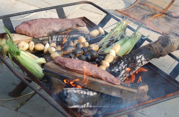Если шашлык начинает надоедать, вместо него можно приготовить другие блюда на углях или костре. Например, картофель с беконом, рыба, куриные крылышки или голени.