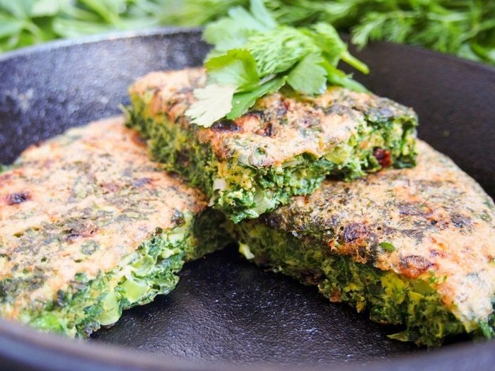 Любители зелени обязательно оценят иранский омлет, потому что он включает в себя просто огромное количество шпината, зеленого лука, кинзы, укропа, петрушки и прочих трав, которые вы можете выбирать по своему усмотрению.