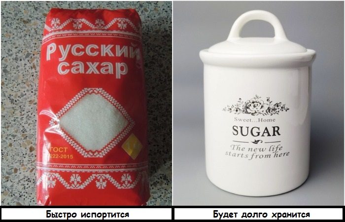 Открытые упаковки с сахаром – настоящий рай для мух, клопов и плесени. Кроме того, продукт может скомковаться и впитать в себя посторонние запахи. Чтобы этого не произошло, его нужно хранить в герметичной емкости или пакете в сухом месте с хорошей вентиляцией. Температура также должна быть оптимальной – не выше 22 градусов. Выбирайте для хранения нижние полки шкафчиков – ближе к полу температура ниже, чем у потолка, ведь теплый воздух от плиты и электрических приборов поднимается именно наверх. Что касается влажности, то ее уровень не должен подниматься выше 70 процентов, иначе сахар начнет отсыревать.