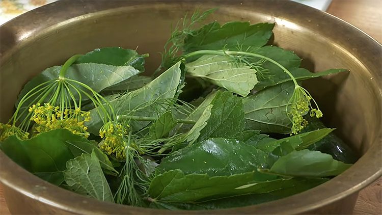 Положите на огурцы листья смородины, вишни и рубленый укроп.