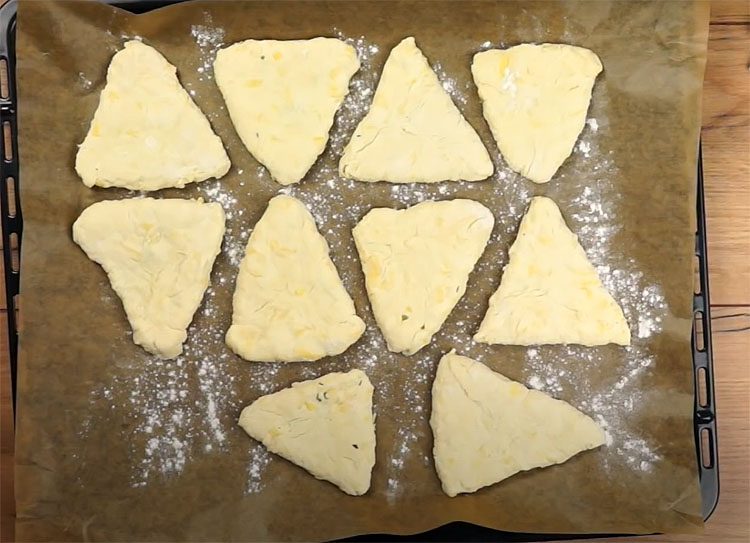 Предварительно разогрейте духовку до 180 градусов. Выложите треугольники на противень, обеспечив достаточное расстояние между ними.