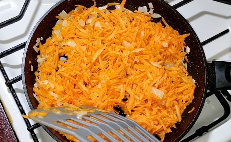 Подготовьте зажарку, натирая на терке морковь и мелко шинкуя лук. Обжарьте лук на среднем огне до золотистого цвета, затем добавьте морковь. Посолите, поперчите, перемешайте и тушите под крышкой на огне ниже среднего в течение 7 минут.