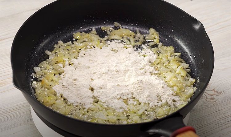5. Разогрейте сковороду и обжарьте мелко нарезанный лук в сливочном масле. После этого добавьте пшеничную муку на сковороду. Залейте 300 мл куриного бульона и варите на слабом огне около 4 минут.