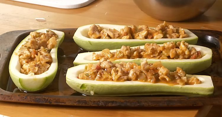 Выложите половинки кабачков на противень и добавьте немного воды, чтобы они лучше пропеклись от испарения влаги. Затем поставьте противень в разогретую духовку на 10 минут при 180 градусах.