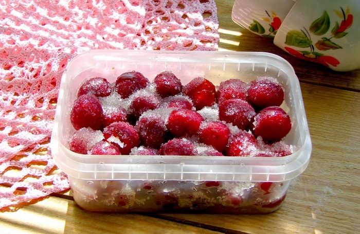 Подготовьте чистые и сухие контейнеры, положите в них вишню, засыпьте сахаром и хорошо размешайте, чтобы он равномерно распределился. Поставьте ягоды в холодильник на сутки, а после того, как они пустят сок, переставьте в морозилку.
