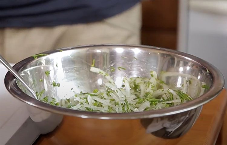 Первый вариант маринада: в первую миску с луком добавьте мелко нарезанный укроп и щепотку черного перца. Тщательно перемешайте лук с укропом и перцем, чтобы ингредиенты равномерно распределились.